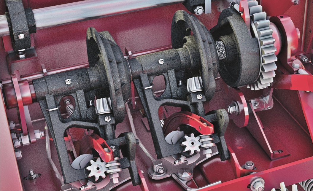The machine is equipped with protective freewheel clutch. It transfers the torque from the propeller shaft to the pulley. When the tractor PTO is deactivated, the pulley continues to rotate by inertia. At this moment, the clutch activates, and the pulley rotation is not transferred on the stopped PTO. Frictional protective clutch smoothes impact at activation of tractor PTO. This increases the long-term operation of the drive. In order to prevent failures of baler units due to clogging by mass or getting foreign objects into working elements, the shear bolt, through which the torque from flywheel to main gearbox of the machine is transferred, is installed.